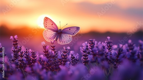 Naklejka premium A butterfly soars over a lavender field at sunset