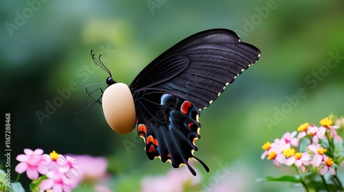 Fototapeta premium A butterfly with an egg, resting on vibrant flowers.