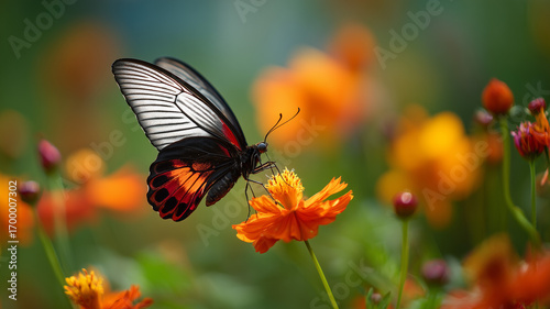 © Subro, Fototapeta premium A butterfly with black, white, and red wings is perched on an orange flower in the sunlit garden. the background of the photo shows blurred flowers and greenery. Ai generated