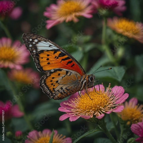 © Pakhtoon, Obraz premium A butterfly with bright, intricate wings resting on a flower.