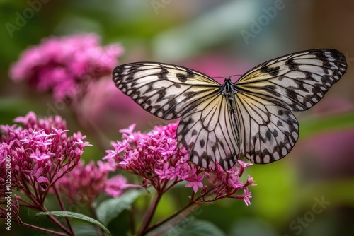 Fototapeta premium A butterfly with intricate wing patterns perched on vibrant pink flowers,...