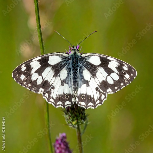 Naklejka premium A butterfly with striking black and white patterns, wings fully spread, perches atop a small, purple flower with green background