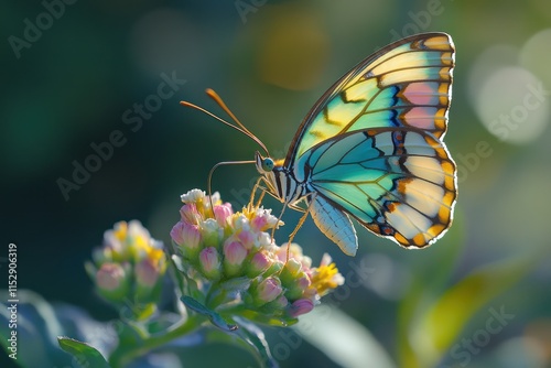 © Irshad, Fototapeta premium A butterfly with wings in shades of turquoise, pink, and yellow perched on a multi-colored flower, captured in high definition, showcasing its fine details.
