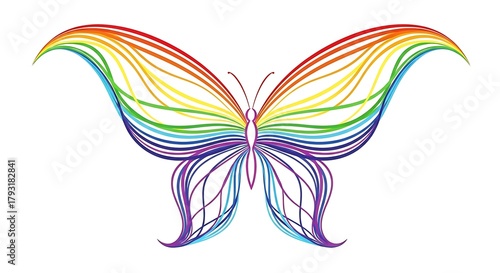 © Usman, Obraz premium A butterfly with wings made of rainbow-colored lines against a white background.