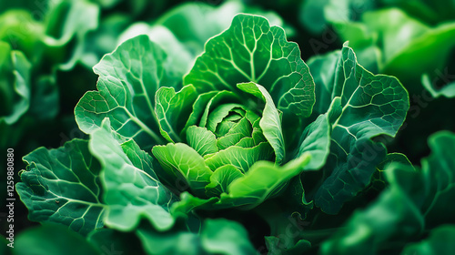 © Anthichada, Fototapeta premium A cabbage plant growing in nutrient-rich soil, Green cabbages growing in field. Organic farming