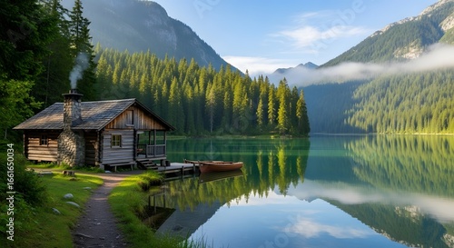 Naklejka premium A cabin by a serene lake surrounded by lush green forest and towering...