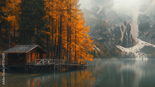 © alfa27, Fototapeta premium A cabin is on a dock by a lake