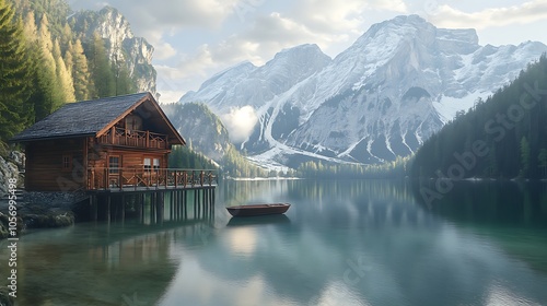 © Engineer Jahid, Fototapeta premium A cabin on a lake with a boat in the water