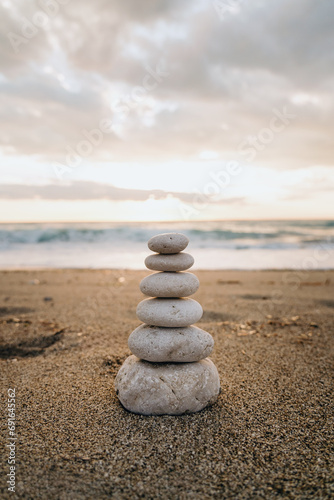 Fototapeta premium A cairn of smooth stones stacked on the sand symbolizes balance and...