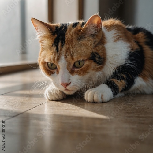 © Veer, Naklejka premium A calico cat licking its paw under a soft light on a simple floor.