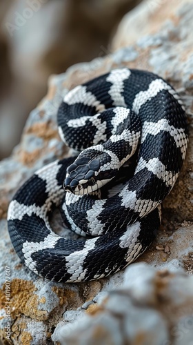 © Anastasiia, Fototapeta premium A California King Snake coiled on a rock in Monterey, displaying its black and white stripes