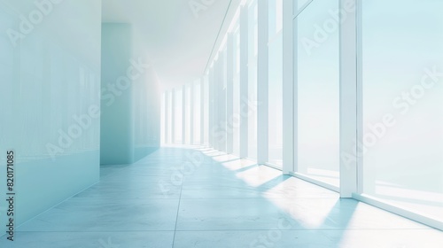 Fototapeta premium A calm and serene corridor with large windows casting soft light on a clean, minimalistic interior design