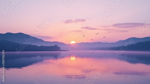 © wicha, Fototapeta premium A calm and tranquil river landscape with the sun setting behind distant hills.