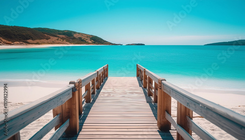 Obraz premium A calm beach scene with a wooden walkway leading to a pristine, white sandy...