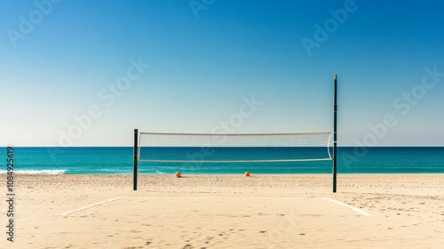 Fototapeta premium A calm beach volleyball court with a net and balls neatly positioned, A sunny, sandy beach with gentle waves in the background