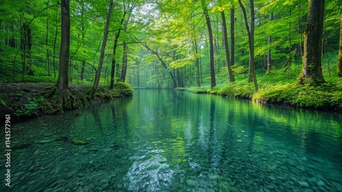 © Alisa, Fototapeta premium A calm, clear river flows through a lush green forest. AI generative. .