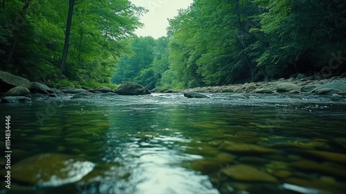 Obraz premium A calm, clear stream flows through a lush forest.