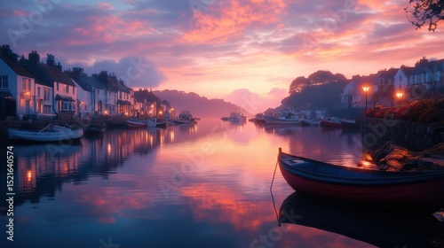© Lonely Dragon, Fototapeta premium A calm coastal village at dawn, with fishing boats lying still on the mirror-like sea and the village bathed in the warm, gentle light of early morning