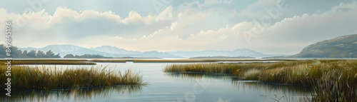 © ZeeZaa, Fototapeta premium A calm lake with a few small islands in the distance