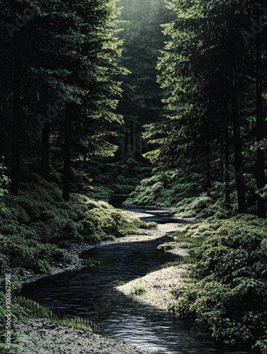 Obraz premium A Calm River Meandering Through a Dense Forest, Emphasizing the Peace and...