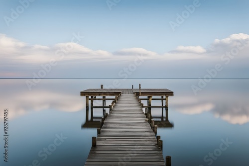 © Toseef, Naklejka premium A calm sea with a wooden pier extending into the water with reflections of the sky on the surface, Ai Generated