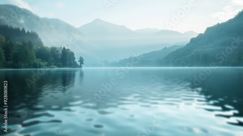 Fototapeta premium A calm, serene lake surrounded by misty mountains and lush greenery, creating...