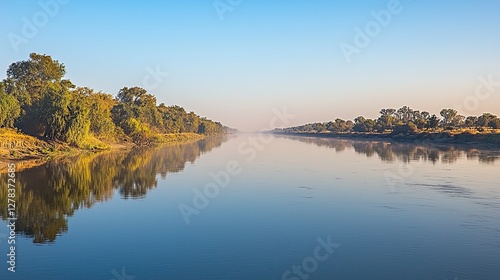 Fototapeta premium A calm stretch of the Niger River at sunrise, with reflections of the sky on the water. Copy space.