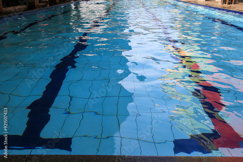 © Pernandi Imanuddin, Obraz premium A calm swimming pool with blue water and ripples on the surface. Swimming Pool with Ripples. A clear blue swimming pool with a black line in the middle The water is rippling and reflecting the light