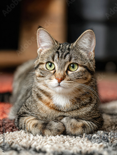 Naklejka premium A calm tabby cat with striking green eyes relaxes on a textured rug, exuding...