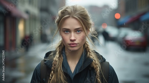 Fototapeta premium A calm woman with braids standing in the rain. Generative AI.