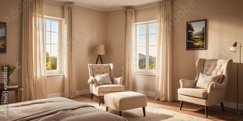 © chick_david, Fototapeta premium A calming beige bedroom with a peaceful landscape painting and a comfortable reading chair.