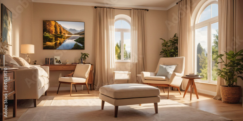 Fototapeta premium A calming beige bedroom with a peaceful landscape painting and a comfortable reading chair.