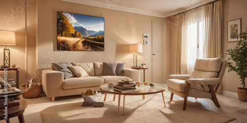 Fototapeta premium A calming beige living room with a peaceful landscape painting and a...