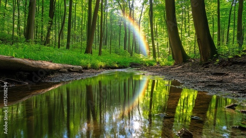 © Pannee, Obraz premium A calming forest scene with a rainbow gracing the horizon and reflecting in a stream