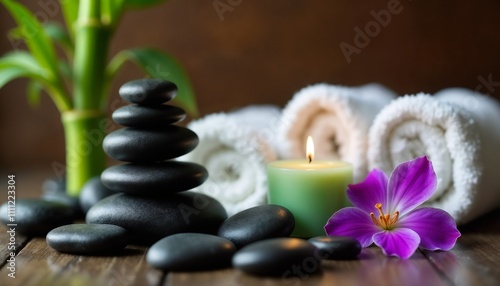 © schiers_images, Obraz premium A calming spa scene featuring rolled white towels, a lit candle, and stacked black stones, surrounded by purple orchids. Perfect for promoting relaxation, wellness, and meditation environments.