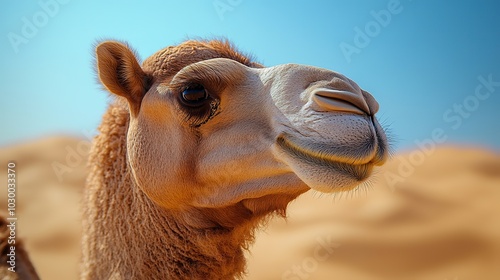 © Lina, Obraz premium A camel head is closely observed in the desert on a sunny day.