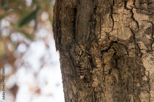 Obraz premium A Camouflaged cicada on a tree trunk with copy space