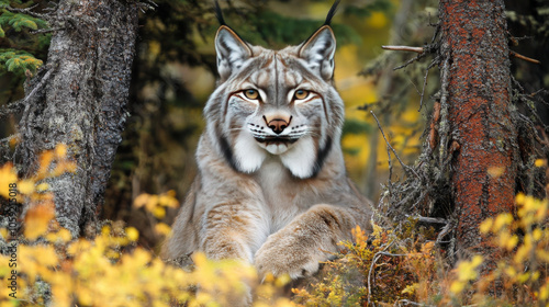 © Aysel, Fototapeta premium A Canadian lynx is hiding in the forest. It's sitting and looking right at the camera. The photo was taken in Whitehorse, Yukon, Canada.