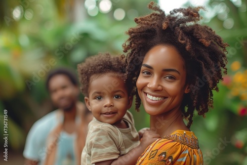 Fototapeta premium A candid portrait of a family with the mother holding her smiling toddler, depicting love and happiness