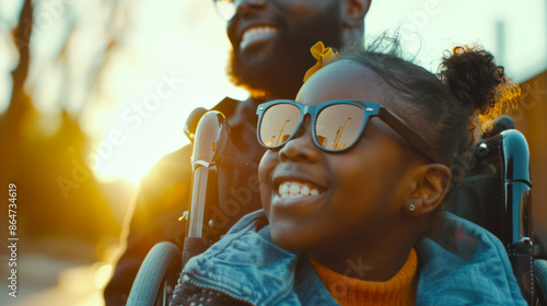 © chekart, Obraz premium A candid portrait of a little black disabled girl in a wheelchair. Dad walks with his daughter at sunset. The scene is bright and sunny