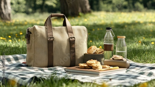 © Pannee, Fototapeta premium A canvas bag on a picnic blanket, holding snacks, books, and a water bottle.