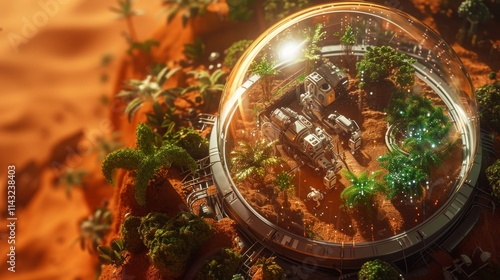 Fototapeta premium A captivating aerial view of a futuristic biodome surrounded by lush vegetation and cutting-edge structures on the red Martian soil, showcasing an advanced off-world colony. AI generated.