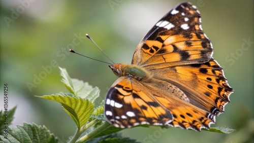 Obraz premium A captivating butterfly with intricately patterned wings perches on a leaf,...