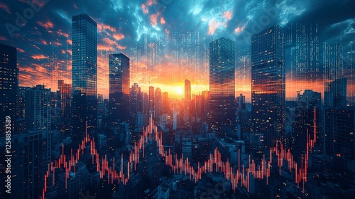© Kristian, Obraz premium A captivating city skyline at sunset enhanced by dynamic graph overlays illustrating the intersection of urban beauty and financial market activity.