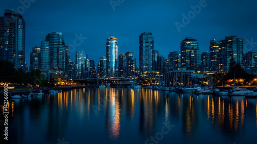 © Abdullah, Naklejka premium A captivating city skyline at twilight, reflecting in tranquil waters, showcasing a serene urban nightscape with warm lights and cool blue hues.