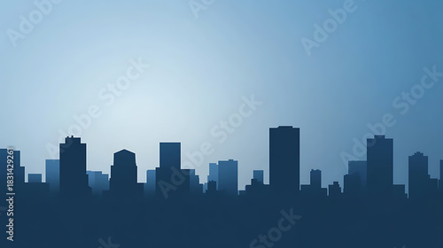 Naklejka premium A captivating cityscape silhouetted against a serene blue backdrop, evokes...