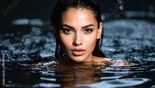 Fototapeta premium A captivating close-up of a beautiful brunette woman partially submerged in...