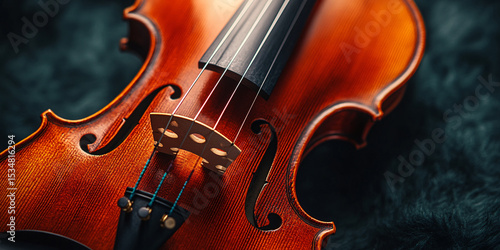 © Aigo labs, Fototapeta premium A captivating close up of a richly toned violin, showcasing its exquisite craftsmanship and smooth, polished wood.