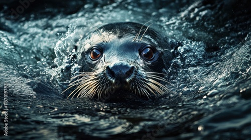 Fototapeta premium A captivating close-up of a seal's face emerging from dark, swirling water....