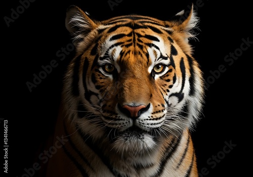Fototapeta premium A captivating close-up of a tiger's face, set against a pure black backdrop....